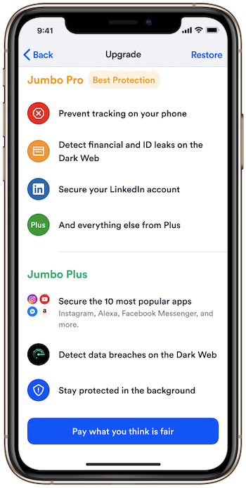 On our most advanced tier, Jumbo Pro, you can prevent hundreds of ad trackers from following you around the web, detect financial and ID data breaches, as well as gain access to protecting professional apps like LinkedIn. You’ll also have access to everything in Jumbo Plus. Jumbo Plus offers access to additional apps like Instagram, Alexa/Amazon, Facebook Messenger, and the ability to monitor unlimited accounts for data breaches.