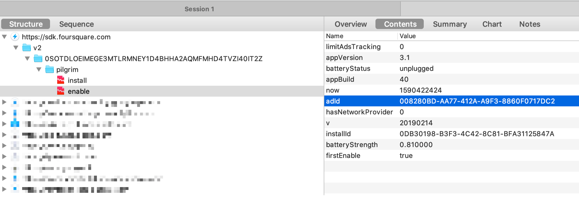 We found that the new release of the app still shares users’ IDFA to Foursquare as shown below. We do not see any indications that the app is still sharing IDFA with Google Firebase, or sending any data to Bugfender.