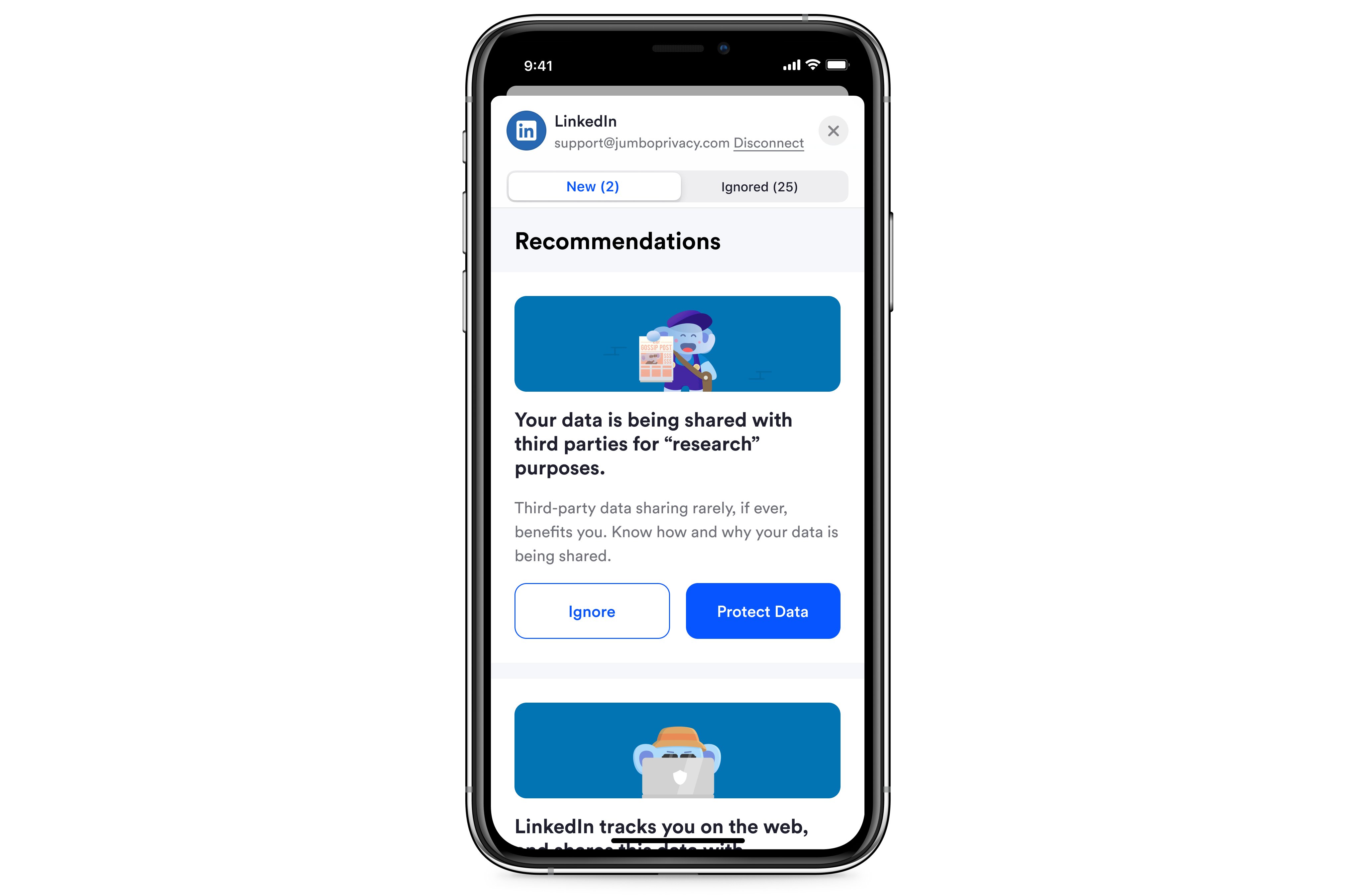 With Jumbo Pro, you can now protect your LinkedIn account. Jumbo can scan more than 20 LinkedIn privacy settings so you can gain back control over how your data is being used and put your best foot forward as you look for a new job. You may be surprised by how your professional data is sold for advertisements and used to target you. You can correct those settings easily with Jumbo Pro.