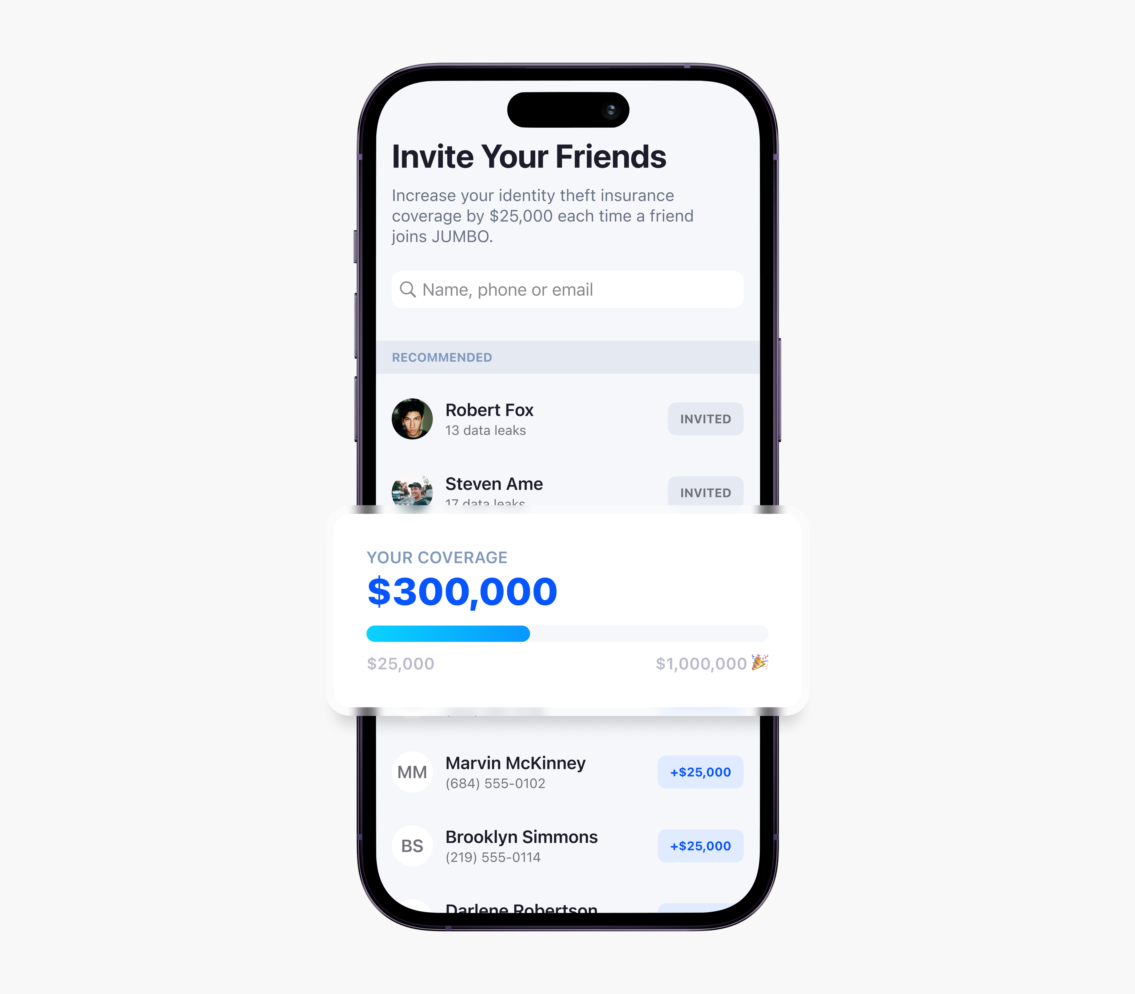 $25,000 in identity theft insurance is just the beginning. For each friend you invite who joins JUMBO, we will increase your coverage by $25,000. Invite 3 friends? You’re covered up to $100,000 in damages. 10 friends? That’s $275,000! There is no limit on the number of friends you can invite and you can reach a maximum of $1,000,000 in identity theft insurance.