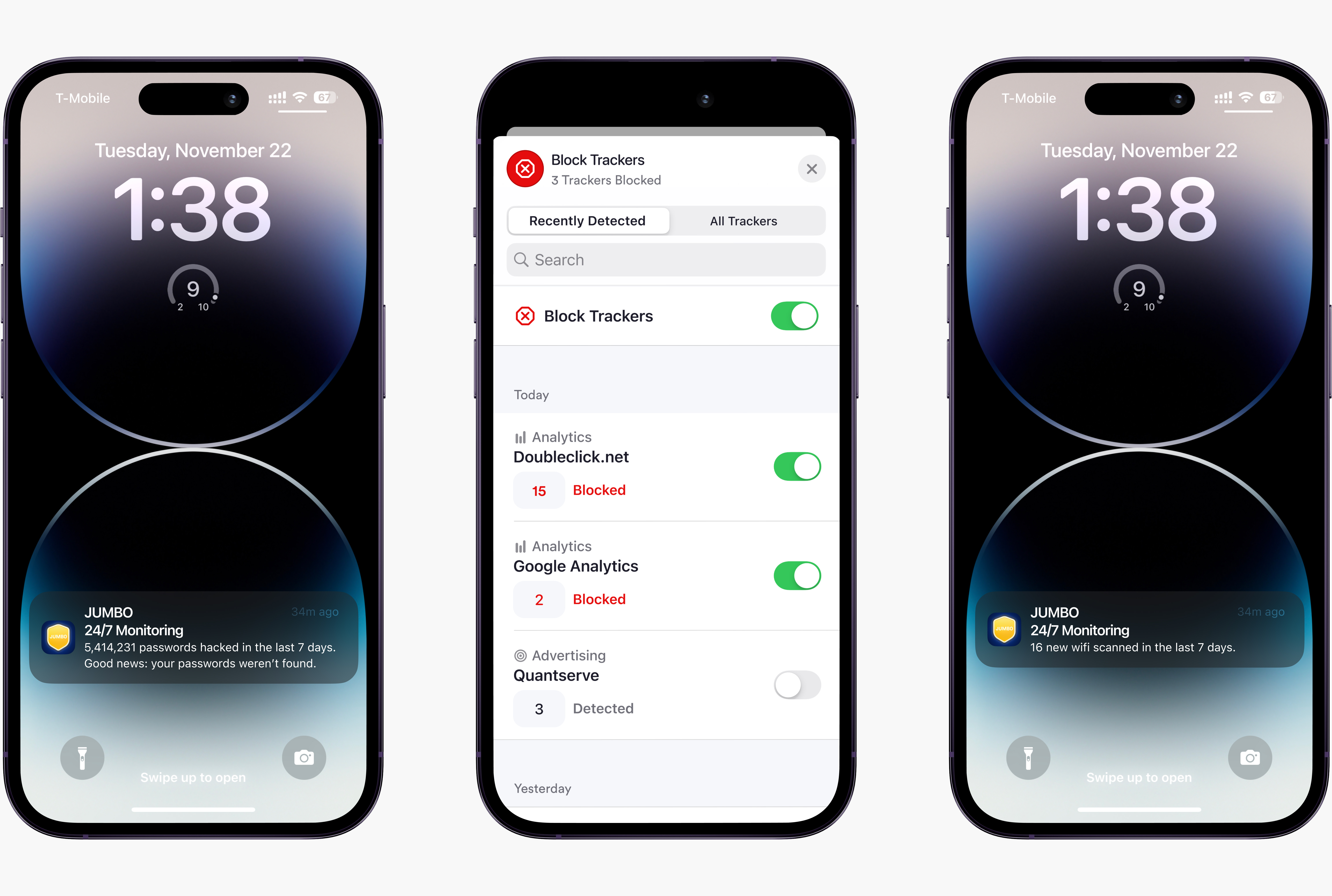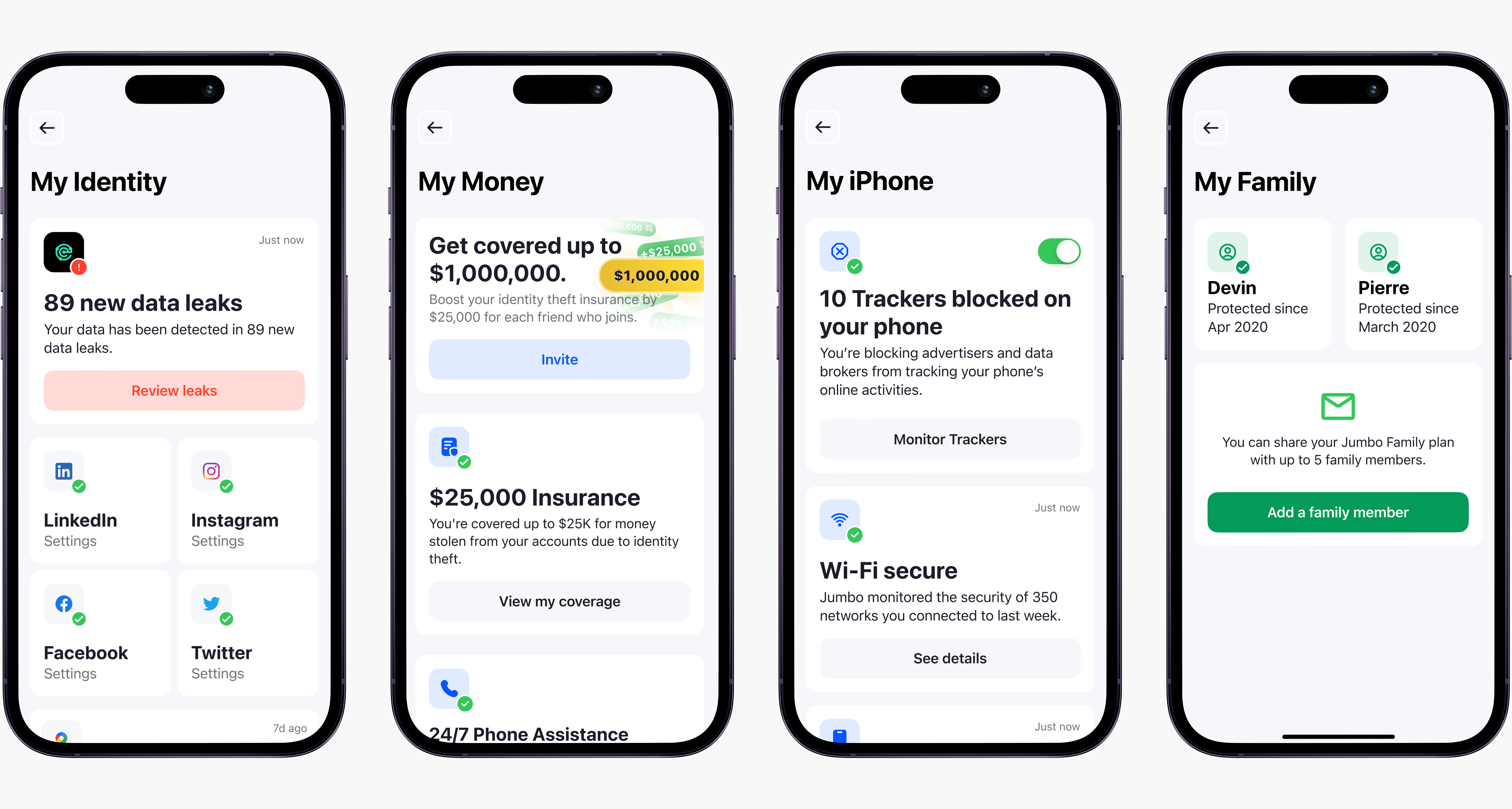 JUMBO 4 also features a completely re-designed app, which is simpler than ever. The app now has 4 different categories: My Identity, My Money, My Phone, and My Family. Within each of these categories, you can find our most powerful features to protect you online. Learn more here.