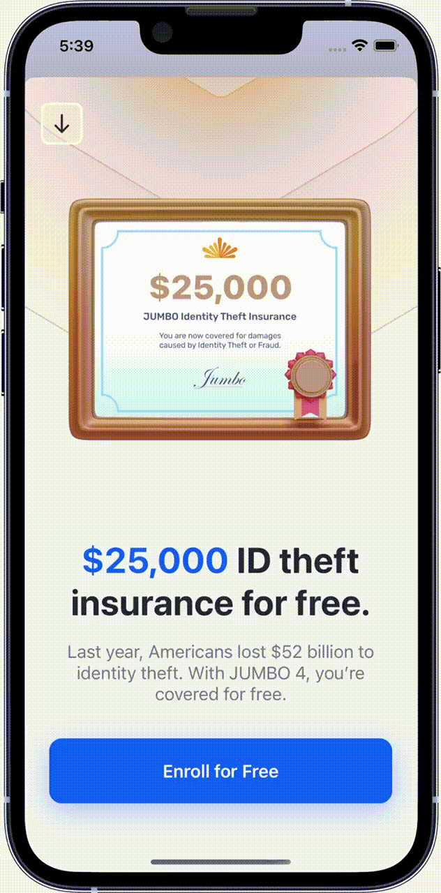 In 2021 alone, nearly 42 million Americans became victims of identity fraud, costing consumers $52 billion - or an average of $1,200 per victim. With JUMBO, you are automatically protected with $25,000 in identity theft insurance in less than 30 seconds, for free.
